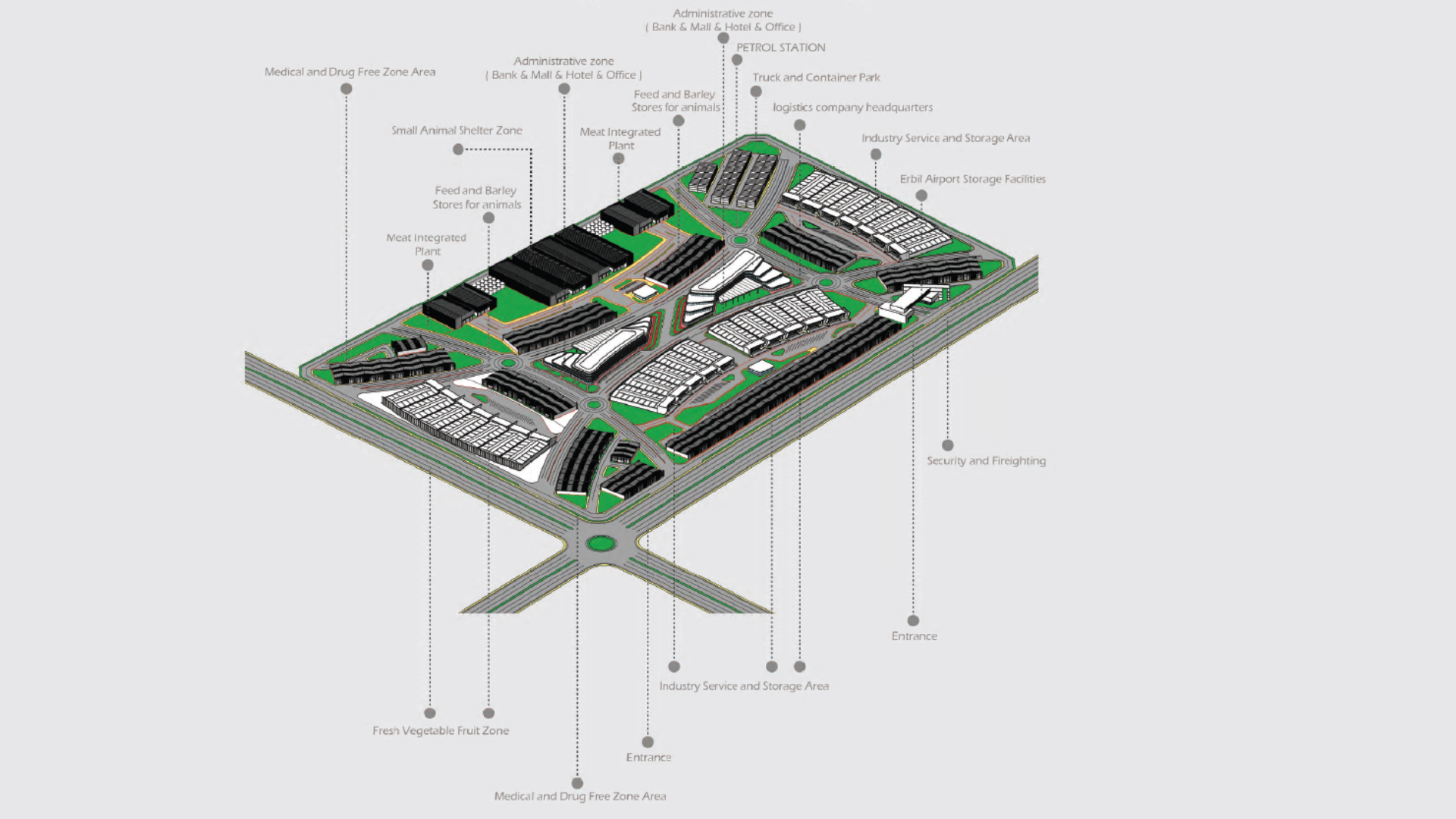?International Terminal and warehouses in Erbil City ( ERBIL Free zone), is a comprehensive development initiative in the Kurdistan Region, addressing economic, cultural, and infrastructural needs. It encompasses various sectors of urban growth, focusing on encouraging investment activities in areas such as tourism, industry, and housing. An integral part of this initiative is the establishment of an International Terminal and Shipment Warehouses in Erbil City (Erbil Free Zone), representing a unique investment endeavor not only in Kurdistan but also in the entire country. Erbil Free Zone, strategically located in the heart of Erbil City, aspires to become the logistics hub of Kurdistan and Iraq as its being The North Hub of Iraq . Upon completion, it is anticipated to create extensive employment opportunities for 4000 people. Covering an area of 475,448 square meters, with the potential to expand to 530,000 square meters, the project integrates specialized zones and facilities catering to diverse industries. Its primary focus is on regulating the movement of containers and trucks in the Kurdistan region, ensuring organized traffic loads in Erbil City.